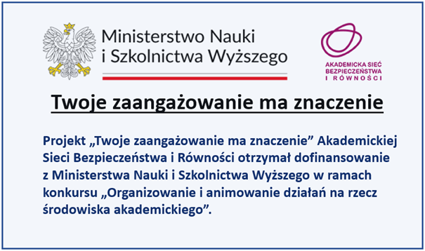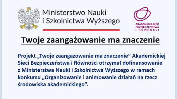 Projekt "Twoje zaangażowanie ma znaczenie" Akademickiej Sieci Bezpieczeństwa i Równości otrzymał dofinansowanie w Ministerstwa Nauki i Szkolnictwa Wyższego w ramach konkursu "Organizowanie i animowanie działań na rzecz środowiska akademickiego".